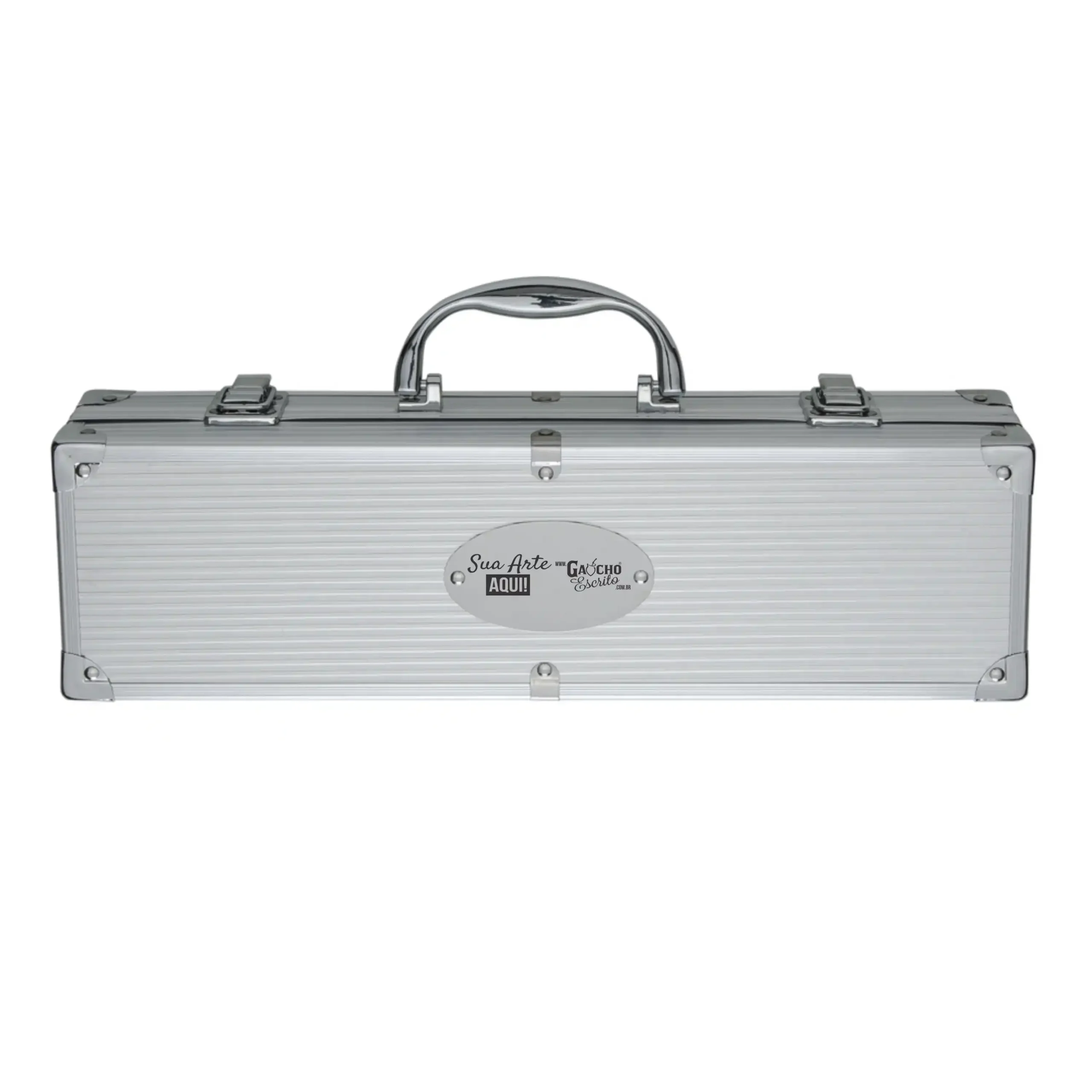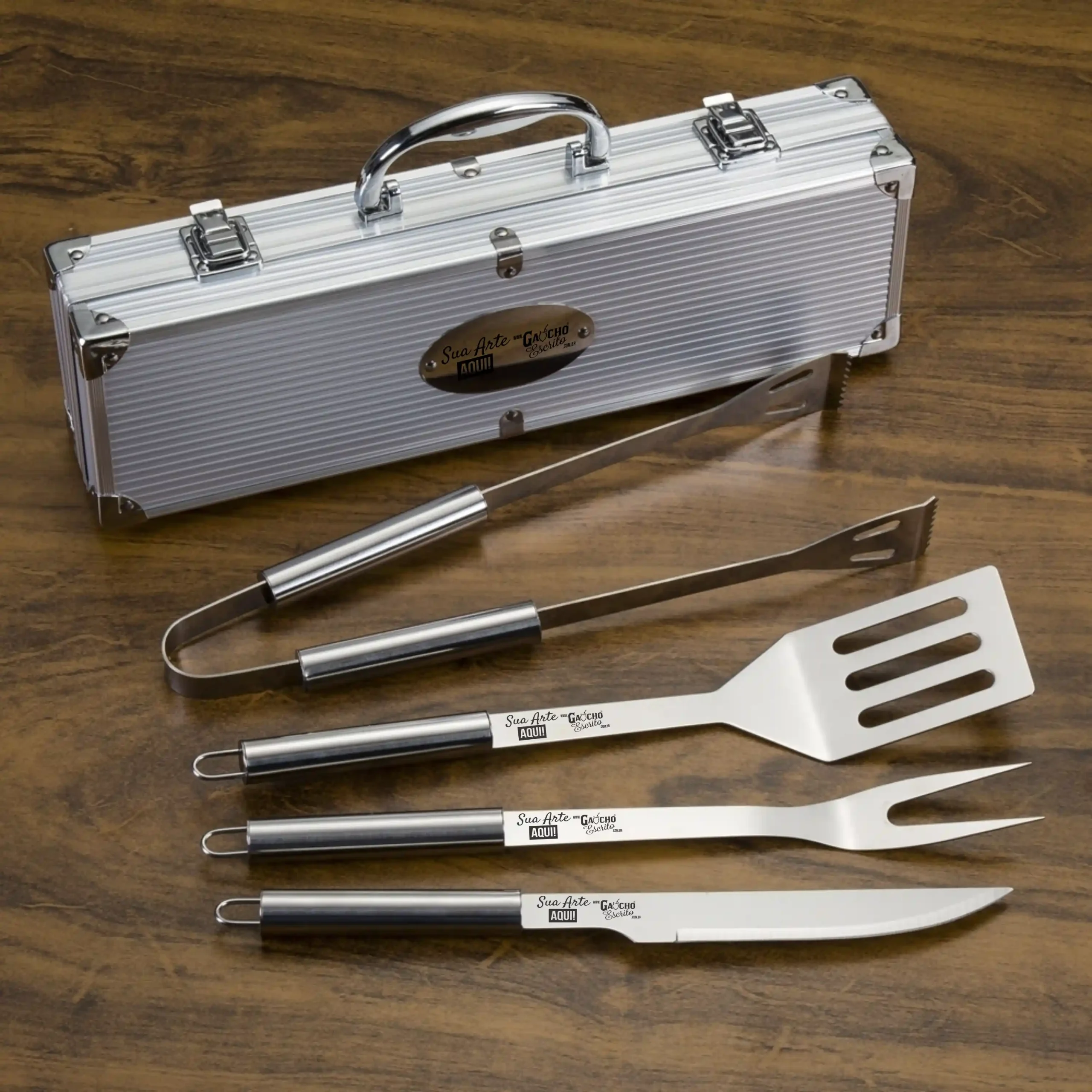 Composto por 4 utensílios essenciais para churrasco, o kit acompanha uma maleta de alumínio resistente com travas de segurança, facilitando o transporte e a organização das peças.